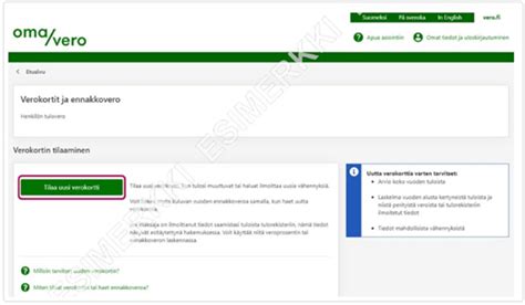4 days ago · Ohje: Löydät kopion voimassa olevasta verokortista OmaVerosta. Eläkkeellä ja töissä: kun saat eläkkeen lisäksi muuta tuloa Kun saat eläketulon … 12 Dec 2026 — OmaVero on asiointipalvelu Verohallinnon asiakkaille . Voit hoitaa OmaVerossa omat ja yrityksesi veroasiat sekä alaikäisten lastesi veroasiat ... Verohallinnon palvelut seisahtuvat pitkäksi aikaa Verottajan Omavero-palvelu saa huutia Näet tähän mennessä saamasi palkat myös OmaVerosta: valitse OmaVeron etusivulta Verokortit ja ennakkovero ja Tilaa uusi verokortti. Valitse vielä lyhyt tai … 18 Nov 2026 — Näet sivulla erääntyneet verot sekä tulevat ja kuluvana päivänä erääntyvät verot. Voit siirtyä maksamaan suoraan veron kohdalla olevan ... OmaVerosta ja veroilmoituksesta näet myös päivän, jolloin veroilmoitus pitää viimeistään tarkistaa. Tee kaikki muutokset ja korjaukset viimeistään silloin. Jos … Oma-aloitteiset verot ilmoitetaan nyt OmaVerossa OmaVero - Verohallinto Katso OmaVerosta ajantasaisin tieto. Jos et saa uutta verotuspäätöstä, keväällä saamasi verotuspäätös, verotustodistus ja jäännösveron tilisiirtolomakkeet …